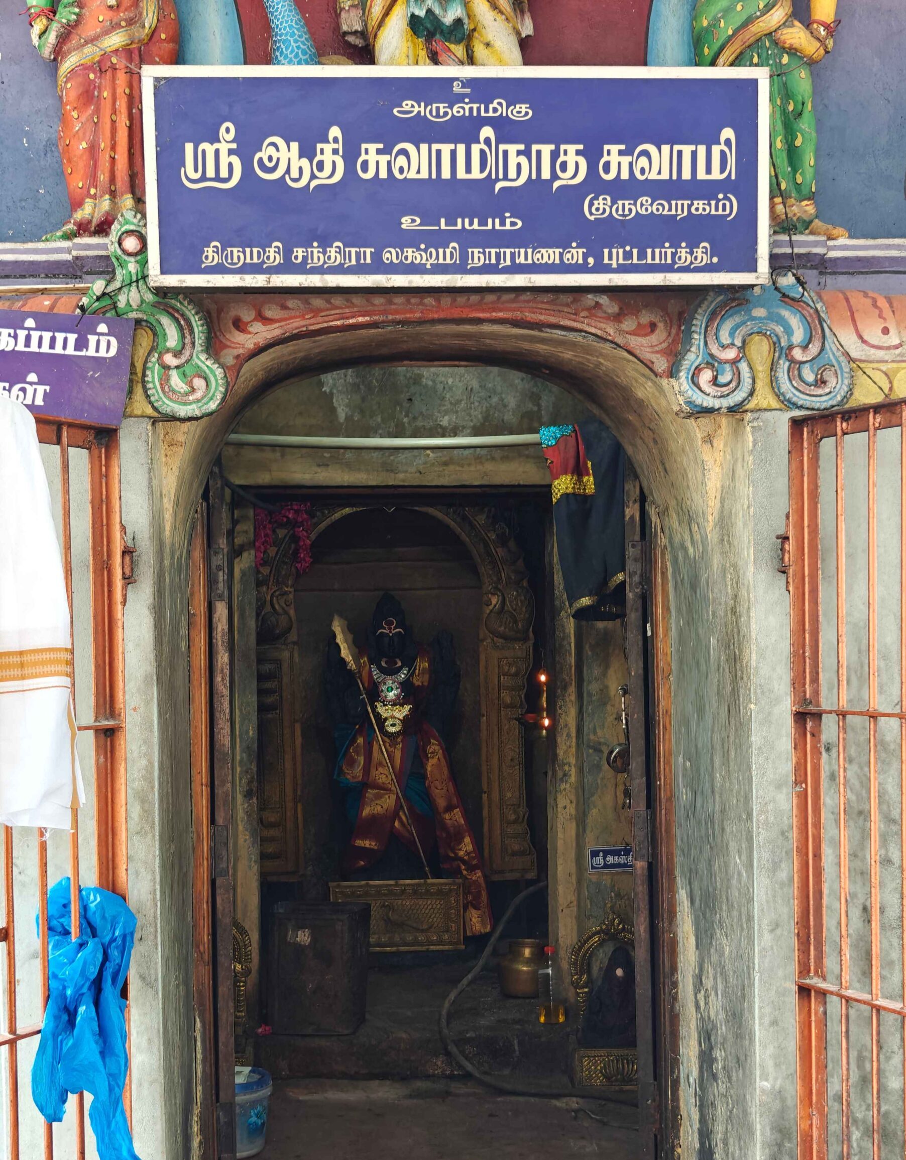 Sri Adhi Kandhanatha Swamy is on the back side of the Shiva temple in a separate sannidhi. Adhi Kandhanatha Swamy is standing with right hand in abhaya hastam and left hand in uru hastam. Arunagirinathar has sung hymns in praise of this Sri Adhi Kandanatha Swamy Temple in his Thirupukazh on Thiruverakam ( Swamimalai ).